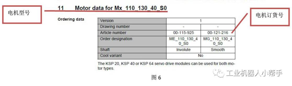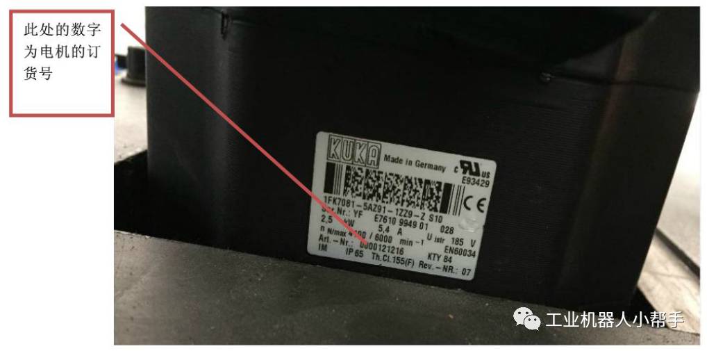 例如下圖中的電機(jī)的訂貨號后六位是121216,參考KUKA文件可查出電機(jī)型號為MX_110_130_40_S0