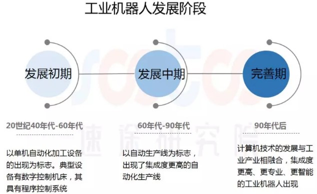 20世紀40年代到60年代是工業機器人發展的初期,以單機自動化加工設備的出現為標志,典型的設備為1952年麻省理工研制的數字控制機床,其具有程序控制系統。相比于傳統手工業,自動化加工設備的優勢更加明顯,更加能適應批量化生產的需要,并逐漸取代了人工的位置。