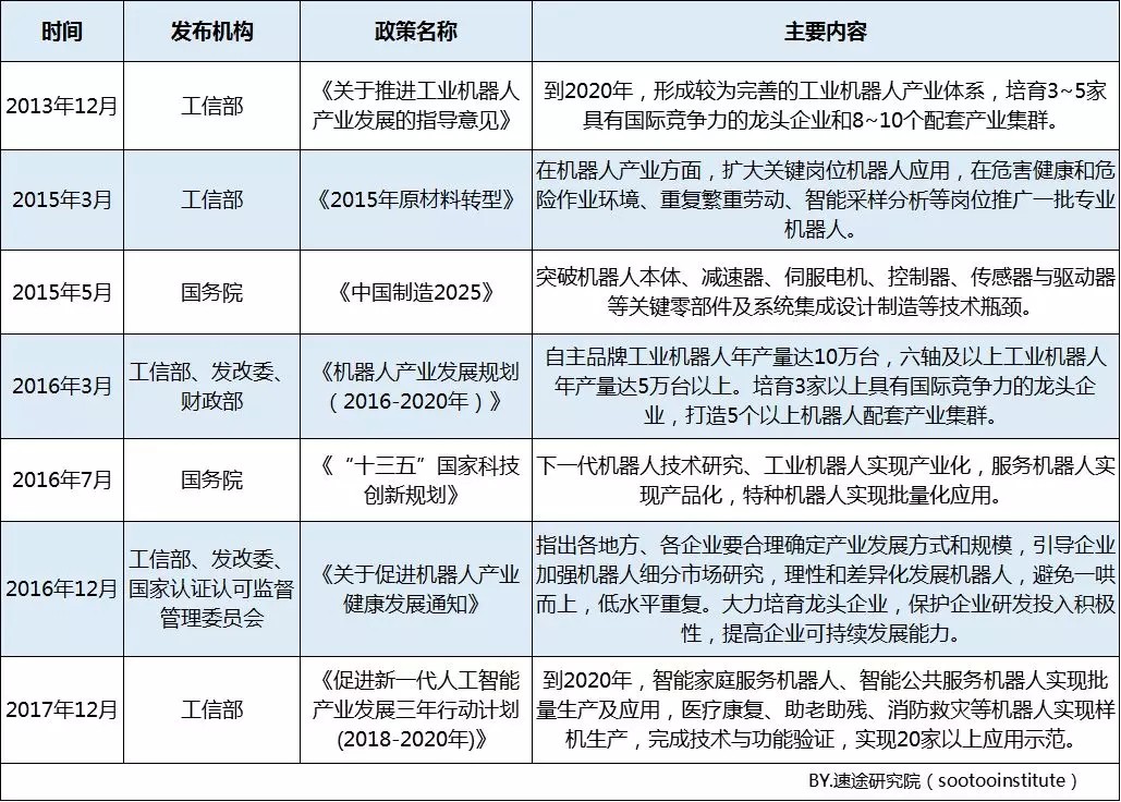 我國工業機器人市場的快速發展,離不開國家政策的大力支持。2015年5月,《中國制造2025》文件里提到,要突破機器人本體、減速器、伺服電機、控制器、傳感器和驅動器等關鍵零部件及系統集成設計制造等技術瓶頸。2016年3月,工信部、發改委、財政部三部門聯合印發《機器人產業發展規劃(2016-2020)》,文件提到自主品牌工業機器人要年產10萬臺以上,六軸及以上工業機器人年產量達5萬臺以上,并打造5個以上機器人產業集群。